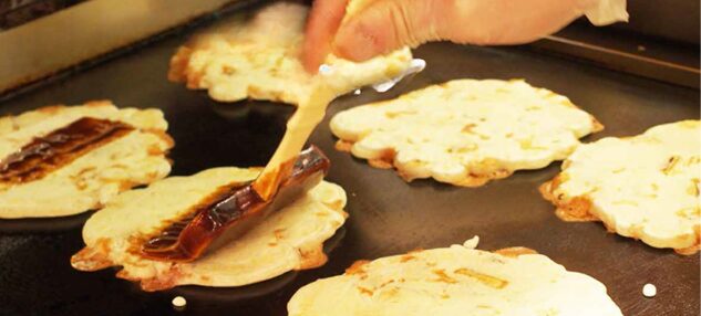 秘伝のダシを効かせた小麦粉の生地に、細かく刻んだイカの切り身を練り込み、特注の重厚な鉄板で上下から「プシューッ!」と一気にプレスして焼き上げます。