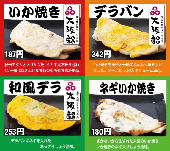 | 1 | いか焼き | 阪神百貨店発祥。上下の鉄板でプレスする製法。 | スナックパークの立ち食いで「焼きたて」を即食い。 | 阪神名物いか焼き (梅田) |