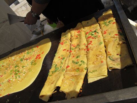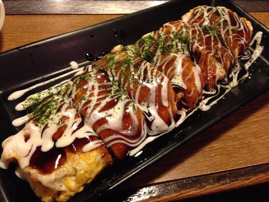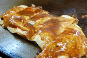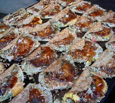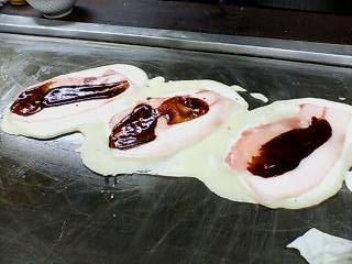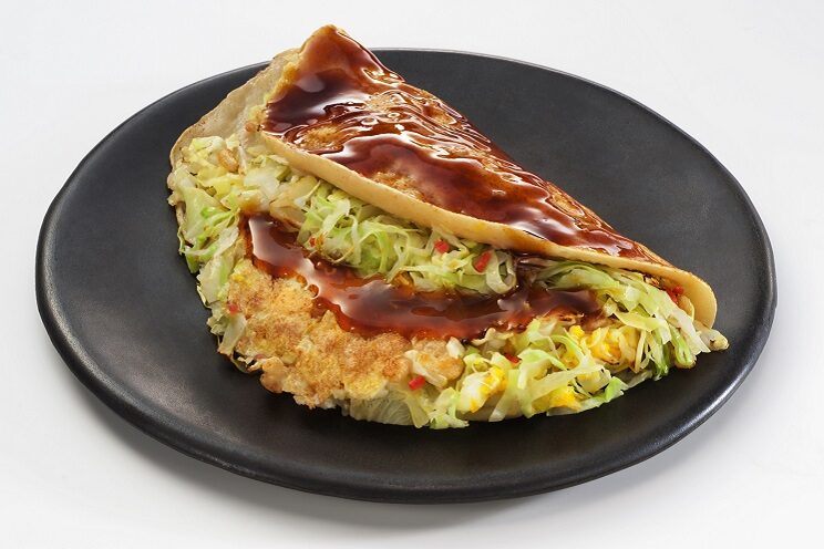 水で溶いた生地にたっぷりのキャベツ、天かす、卵を乗せ、ソースを塗って二つ折りにした極めてシンプルな料理。