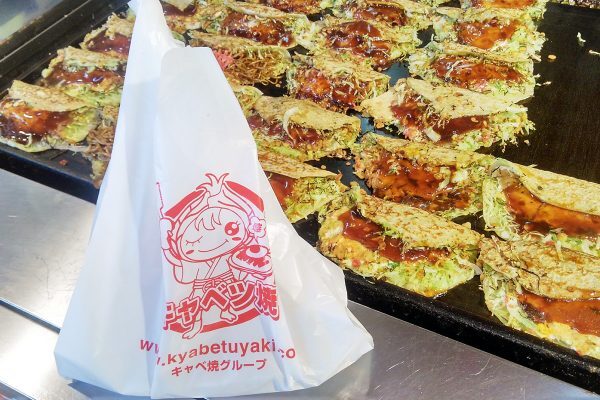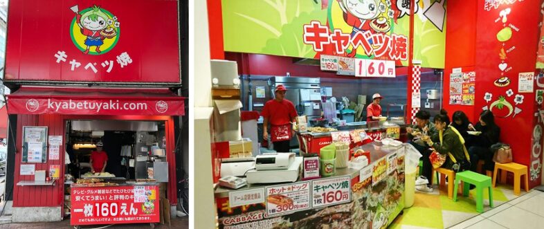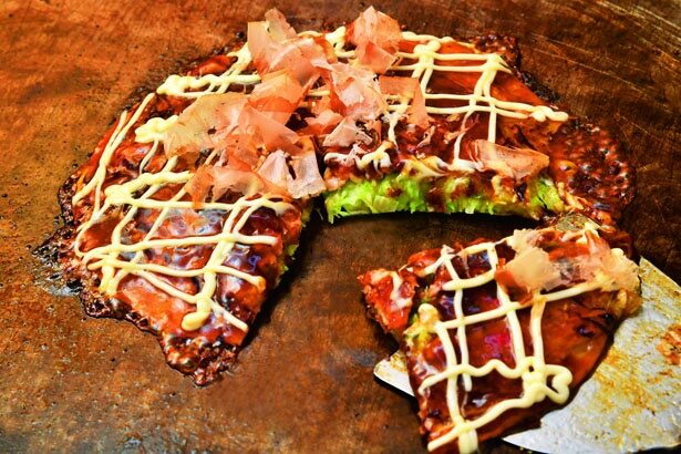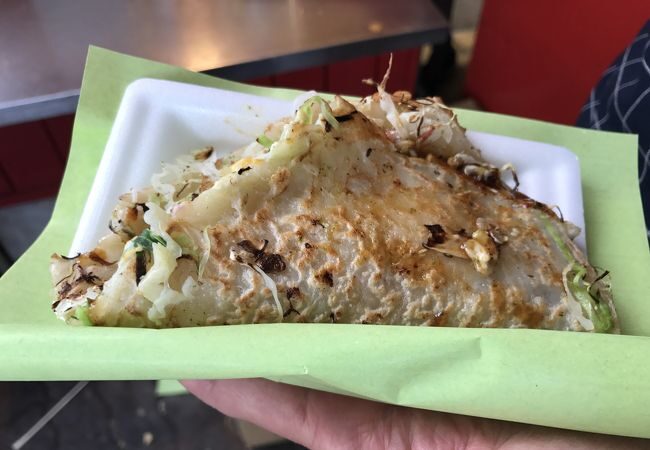 店先の大きな鉄板で、大量のキャベツの山が次々と生地に乗せられ、手際よく二つ折りにされていく光景は圧巻です。