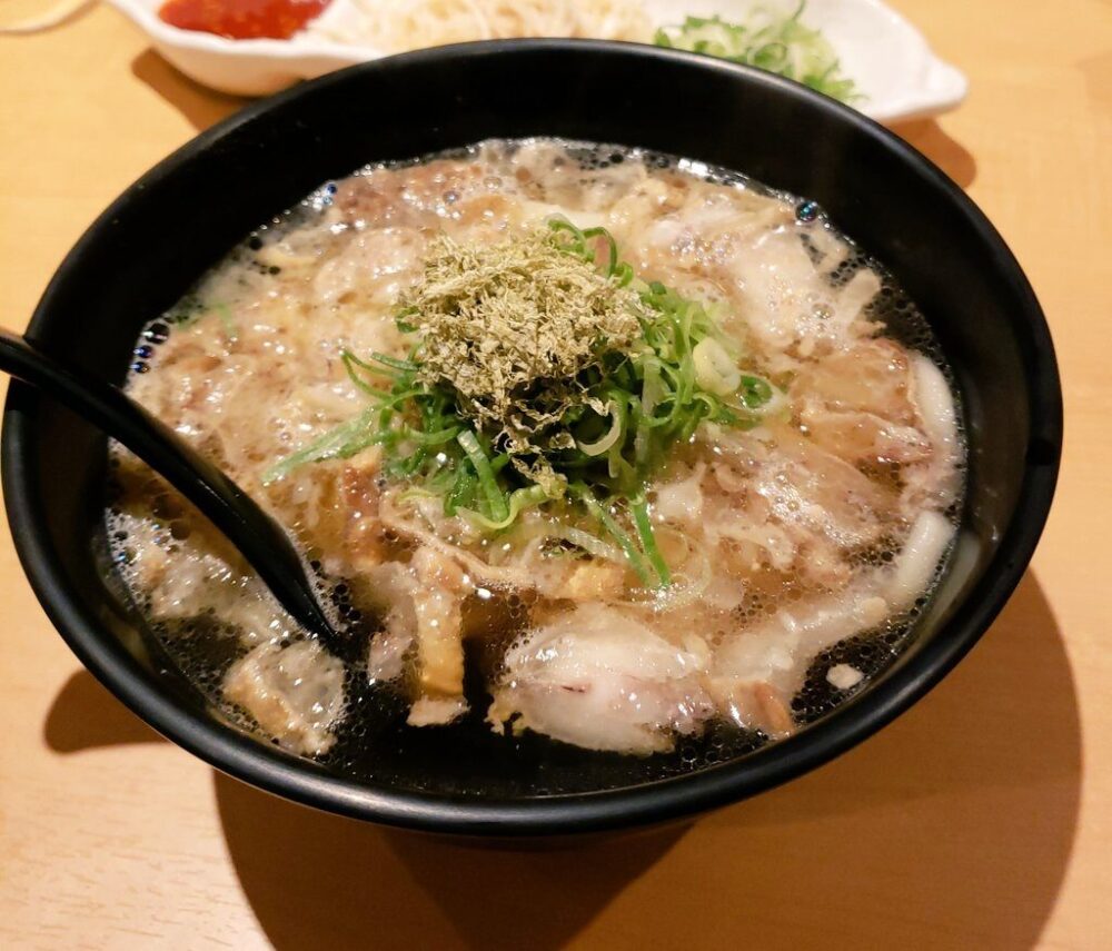 うどんのダシに油かすの濃厚なコクと甘みがジュワッと溶け出し、最後の一滴まで飲み干したくなる、中毒性抜群のソウルフードです。