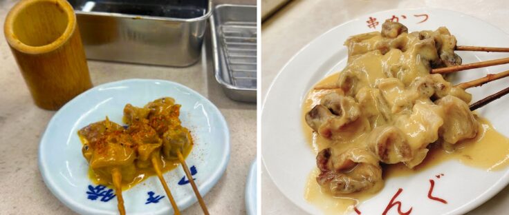 | 4 | どて焼き | 鉄鍋の縁(どて)で味噌を煮込んだことが名前の由来。 | 串カツが揚がる前に即注文し、七味をたっぷりかける。 | てんぐ、八重勝 (新世界) |