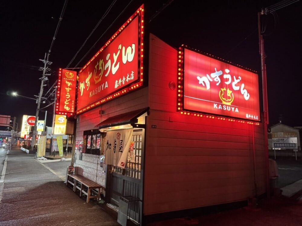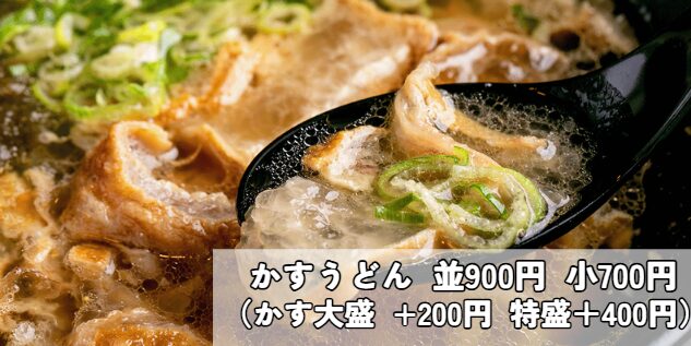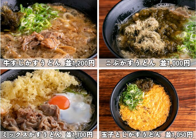 | 3 | かすうどん | 南河内地方で愛されてきた、牛の腸を揚げた「油かす」を使用。 | 脂の旨味がダシに溶け出すのを待ち、白ご飯と合わせる。 | KASUYA(加寿屋) 各店舗 |