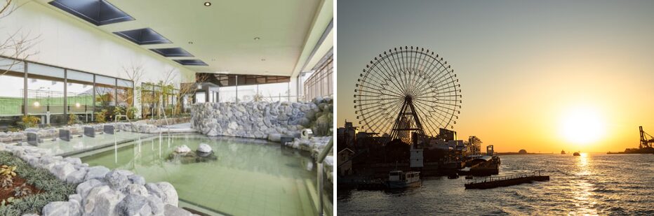 りんくうプレジャータウンシークル内にある温浴施設へ。岩塩風呂や露天風呂で足を伸ばし、海風を感じながら極上のリラックスタイム。