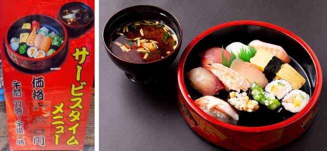 | サービスタイムメニュー | 【隠れ人気ネタ】 11:00〜14:00限定。 赤だしが付いたボリューム満点のセットがなんと660円! |
