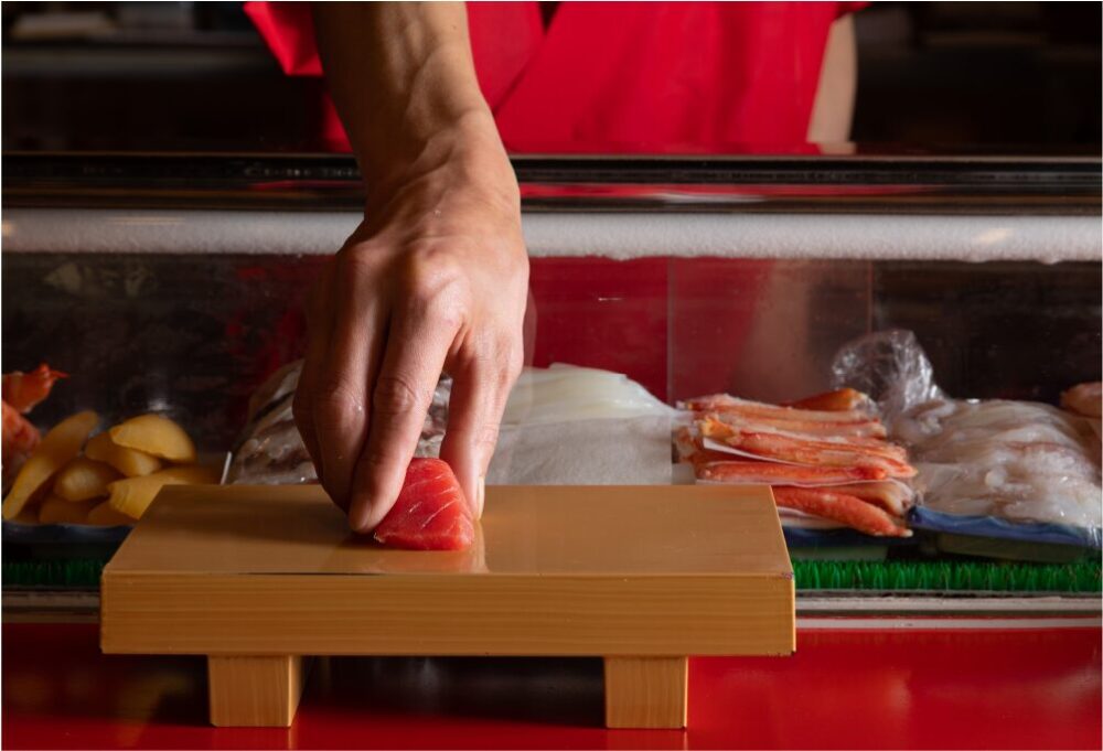 レーンの内側には熟練の職人たちがズラリと並び、注文を受けてから目の前で絶品のお寿司を手握りしていく圧倒的なライブ感。