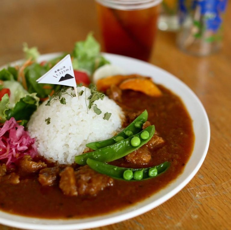 棚田カレー2階のカフェで味わえる、棚田の風景を見立てた名物