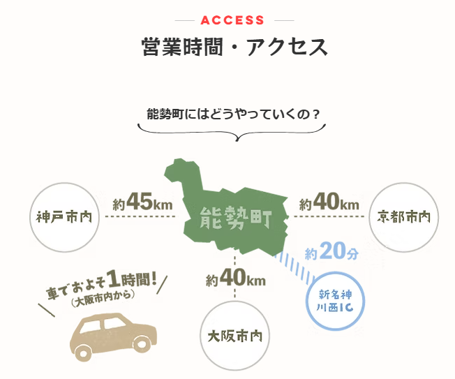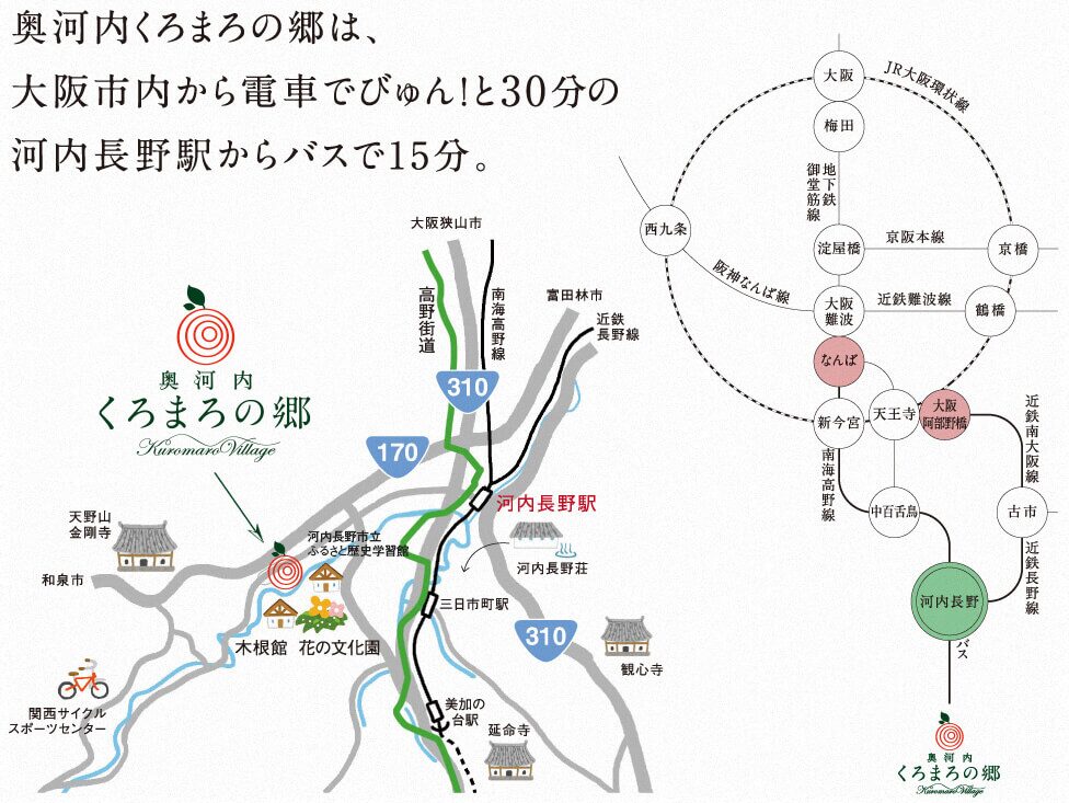 • アクセス:大阪市内から阪神高速14号松原線・阪和自動車道を経由し、国道309号へ。