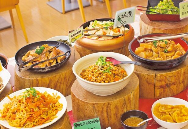 • 大人気ビュッフェ: 地元野菜をたっぷり使った、体に優しく美味しい手作りお惣菜が食べ放題。