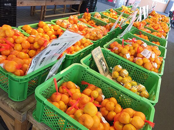 午前中の活気あふれる直売所で、泉州特産の新鮮な野菜や果物を買い求めましょう。