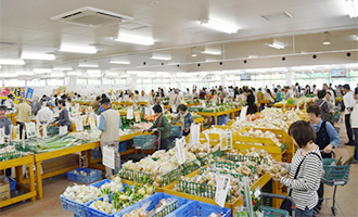 午前中の活気あふれる直売所で、泉州特産の新鮮な野菜や果物を買い求めましょう。