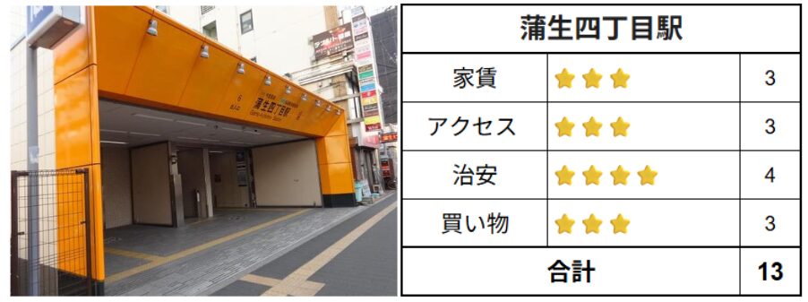 | 10 | 蒲生四丁目駅 (城東区) | 13 | 3 | 3 | 4 | 3 | 治安の良さ◎! 古民家カフェや下町情緒を楽しみたい人 |