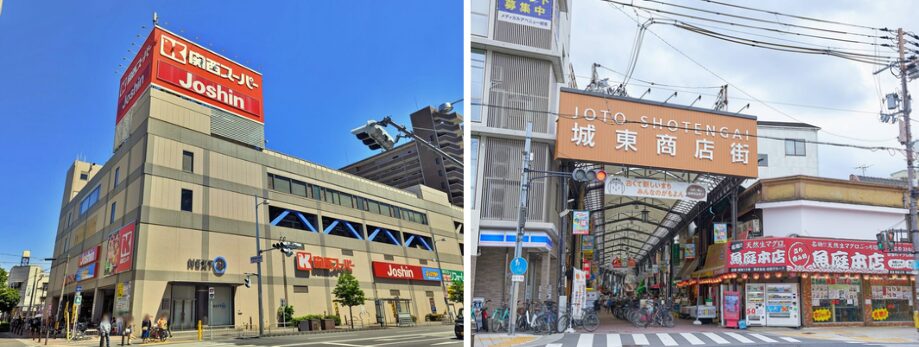 買い物環境も充実しており、駅前の交差点を中心に「関西スーパー」や「コノミヤ」、活気ある「城東商店街」が揃っています。