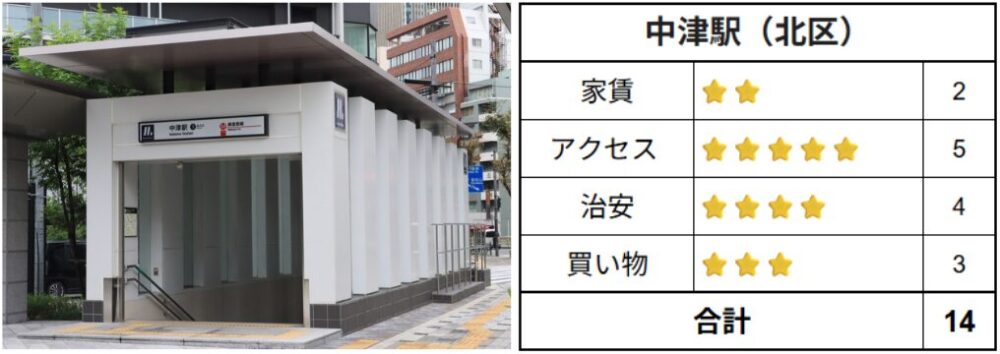 | 7 | 中津駅 (北区) | 14 | 2 | 5 | 4 | 3 | タイパ最強! 家賃が高くても梅田徒歩圏内に住みたい人 |