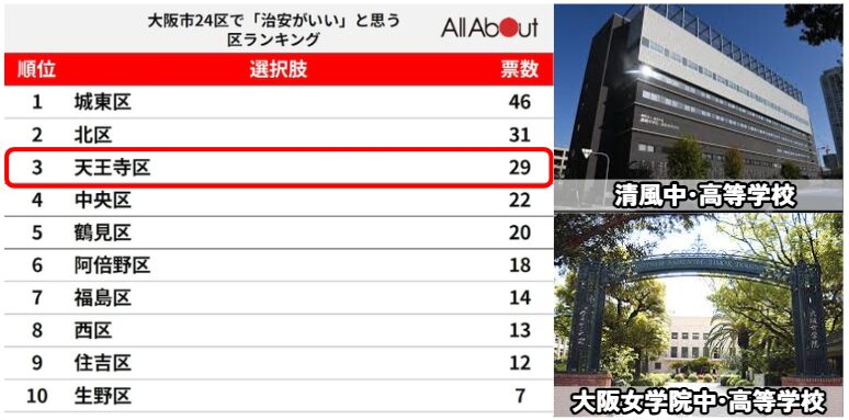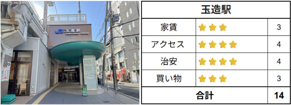| 5 | 玉造駅 (天王寺区) | 14 | 3 | 4 | 4 | 3 | 治安最優先! 文教地区の安心感と落ち着きを求める人 |