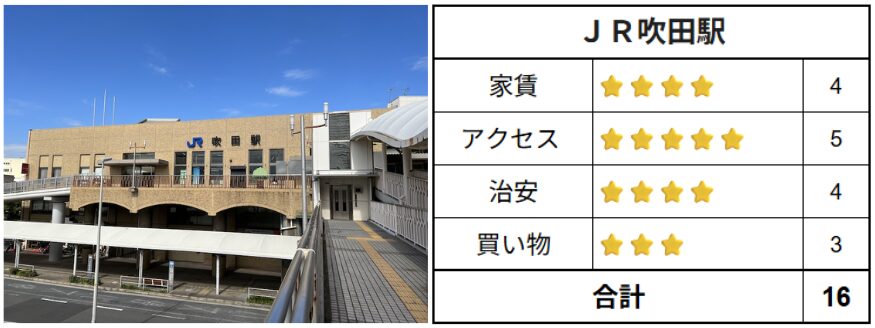 | 3 | JR吹田駅(吹田市) | 16 | 4 | 5 | 4 | 3 | 梅田まで約9分! 北摂の治安と圧倒的アクセスを求める人 |