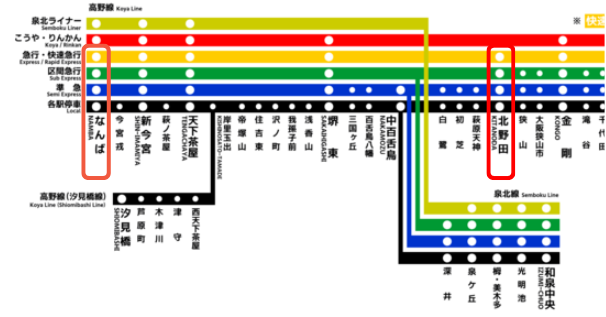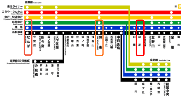 - 難波(なんば)駅まで:南海高野線(急行)で乗り換えなし約20分