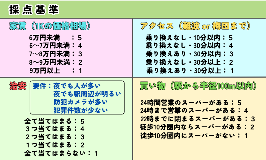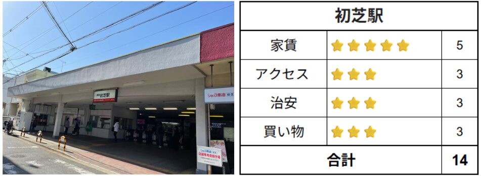 | 4 | 初芝駅 (堺市東区) | 14 | 5 | 3 | 3 | 3 | とにかく家賃重視! 深夜スーパー必須で節約したい人 |