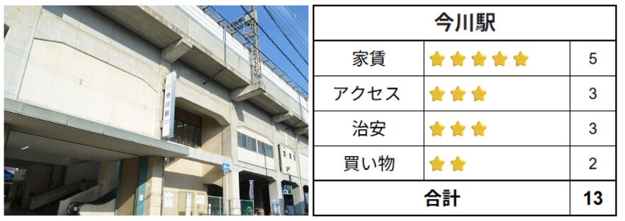 | 9 | 今川駅 (東住吉区) | 13 | 5 | 3 | 3 | 2 | 固定費削減! 自転車をフル活用して天王寺に出たい人 |