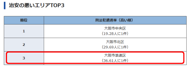 治安面については2025年の警備会社・ALSOKの調査でも、大阪市内でワースト3に入るなど課題が残ります。